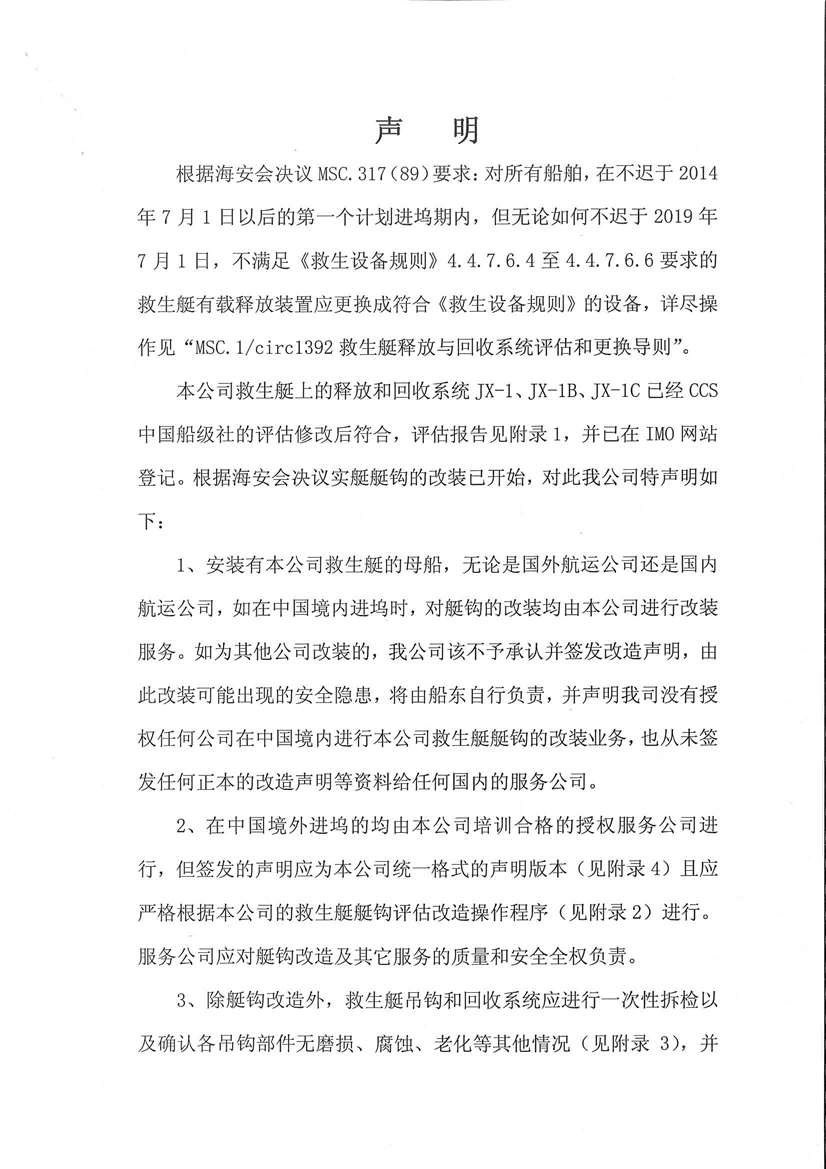 我司于2014年7月1日已发布过声明,现再次郑重声明如下,希望广大用户朋友本着对船员生命负责,注重安全的原则,谨慎选择救生艇设备服务商.