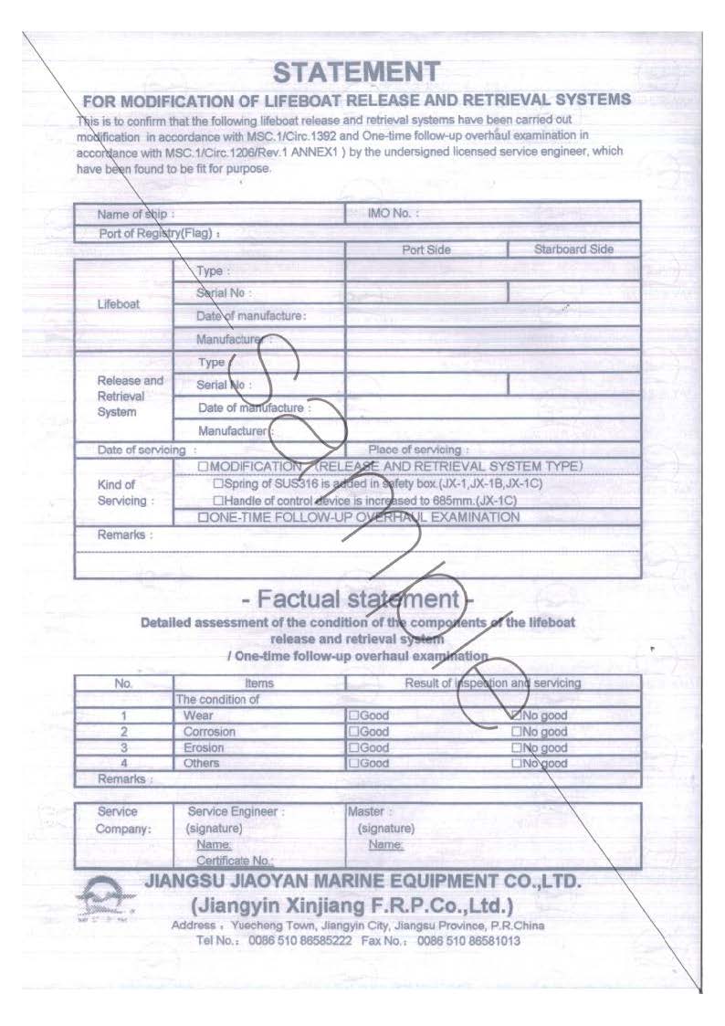 近期,发现国内存在一些服务公司为牟取私利,置船员生命安全于不顾,未经我公司专业培训和认可,擅自对我公司(华体会官方网页版/江阴新江玻璃钢有限公司)生产的救生艇设备进行救生艇吊钩改造,同时签发伪造的声明,因此引起了重大的安全事故.重要提示:华体会官方网页版(江阴新江玻璃钢有限公司)对一切未经本公司专业培训和认可的服务商提供的对本公司产品的所有服务不承担任何责任,并保留对其追究法律责任的权利.