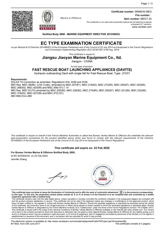 附件1:江苏佼燕高速救助艇架 EC型式认可证书。
